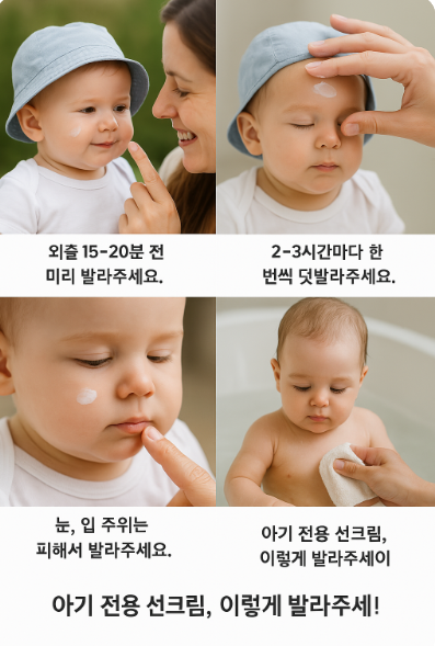 | 6개월~12개월 | 저자극 무기자차 제품 소량 사용 가능 | 선크림+물리적 차단(모자, 옷 등) |