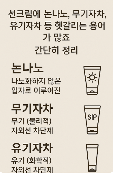 선크림을 고르다 보면 논나노, 무기자차, 유기자차 등 헷갈리는 용어가 많죠. 간단히 정리해 드릴게요!