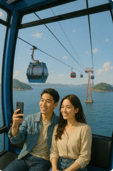전국 유일의 바다 위 케이블카! 여수 앞바다를 한눈에 볼 수 있어요. 야경시간에 타면 진짜 로맨틱 그 자체 💕