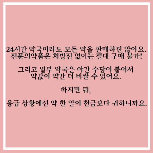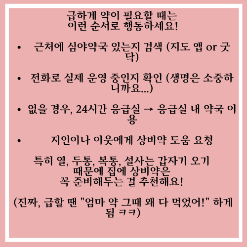 실제로 이런 상황에서 **24시간 약국**을 찾지 못해 응급실까지 가는 경우도 종종 있습니다.
