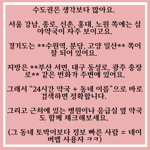 수도권은 생각보다 많아요. 서울 강남, 종로, 신촌, 홍대, 노원 쪽에는 심야약국이 자주 보이고요.