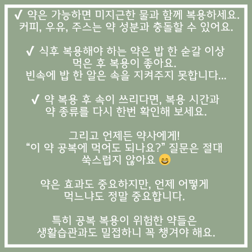 ✔ 약은 가능하면 **미지근한 물**과 함께 복용하세요. 커피, 우유, 주스는 약 성분과 충돌할 수 있어요.