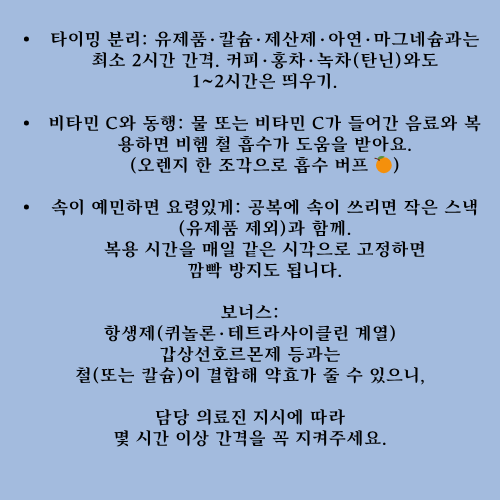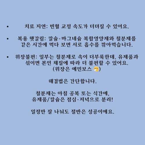 보너스: 항생제(퀴놀론·테트라사이클린 계열)·갑상선호르몬제 등과는 철(또는 칼슘)이 결합해 약효가 줄 수 있으니, 담당 의료진 지시에 따라 몇 시간 이상 간격을 꼭 지켜주세요.