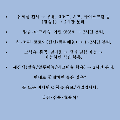 - 유제품 전체 — 우유, 요구르트, 치즈, 아이스크림 등(칼슘↑) → 2시간 분리.