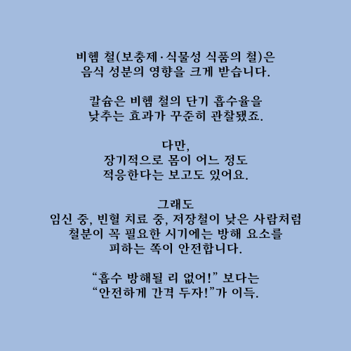 비 헴 철(보충제·식물성 식품의 철)은 음식 성분의 영향을 크게 받습니다. 칼슘은 비 헴 철의 단기 흡수율을 낮추는 효과가 꾸준히 관찰됐죠. 다만, 장기적으로 몸이 어느 정도 적응한다는 보고도 있어요. 그래도 임신 중, 빈혈 치료 중, 저장철이 낮은 사람처럼 철분이 꼭 필요한 시기에는 방해 요소를 피하는 쪽이 안전합니다. “흡수 방해될 리 없어!” 보다는 “안전하게 간격 두자!”가 이득.