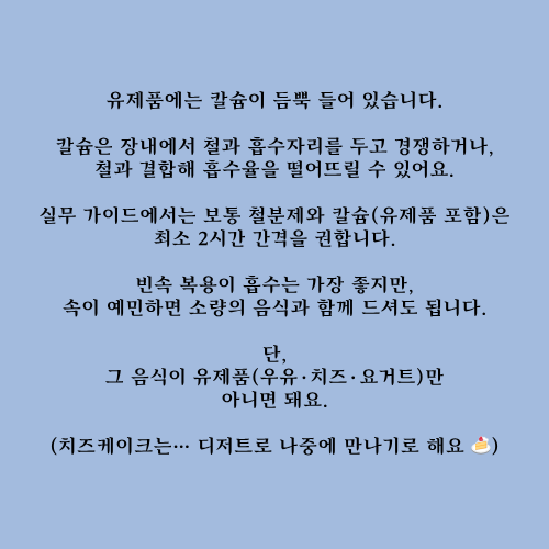 유제품에는 칼슘이 듬뿍 들어 있습니다. 칼슘은 장내에서 철과 흡수자리를 두고 경쟁하거나, 철과 결합해 흡수율을 떨어뜨릴 수 있어요. 실무 가이드에서는 보통 철분제와 칼슘(유제품 포함)은 최소 2시간 간격을 권합니다. 빈속 복용이 흡수는 가장 좋지만, 속이 예민하면 소량의 음식과 함께 드셔도 됩니다. 단, 그 음식이 유제품(우유·치즈·요구르트)만 아니면 돼요. (치즈케이크는… 디저트로 나중에 만나기로 해요 🍰)