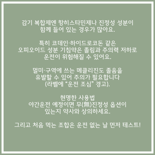 감기 복합제엔 항히스타민제나 진정성 성분이 함께 들어 있는 경우가 많아요. 특히 코데인·하이드로코돈 같은 오피오이드 성분 기침약은 졸림과 주의력 저하로 운전이 위험해질 수 있어요.