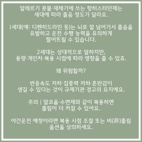 알레르기 콧물·재채기에 쓰는 항히스타민제는 세대에 따라 졸음 정도가 달라요. 1세대(예: 디펜히드라민 등)는 뇌로 잘 넘어가서 졸음을 유발하고 운전 수행 능력을 유의하게 떨어뜨릴 수 있습니다. 2세대는 상대적으로 덜하지만, 용량·개인차·복용 시점에 따라 영향을 줄 수 있죠.