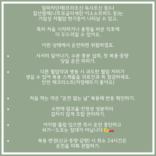 알파차단제(프라조신·독사조신 등)나 질산염제(니트로글리세린·이소소르비드 등)는 기립성 저혈압·현기증이 나타날 수 있고, 특히 처음 시작하거나 용량을 바꾼 직후에 더 두드러질 수 있어요. 이런 상태에서 운전하면 위험하겠죠.