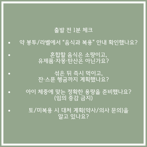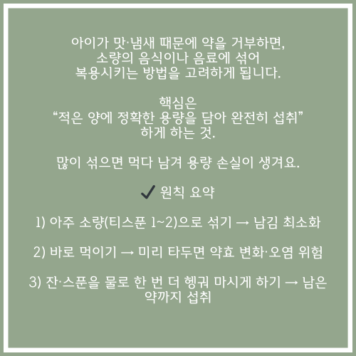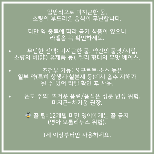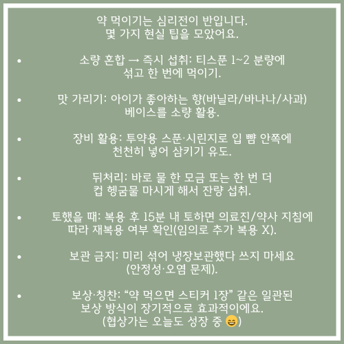 아이가 맛·냄새 때문에 약을 거부하면, 소량의 음식이나 음료에 섞어 복용시키는 방법을 고려하게 됩니다. 핵심은 “적은 양에 정확한 용량을 담아 완전히 섭취”하게 하는 것. 많이 섞으면 먹다 남겨 용량 손실이 생겨요.
