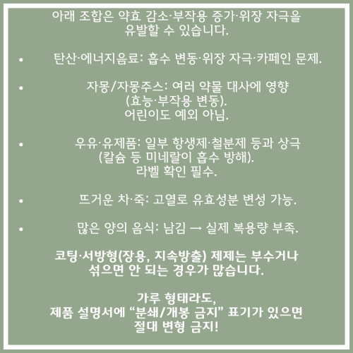 - 우유·유제품: 일부 항생제·철분제 등과 상극(칼슘 등 미네랄이 흡수 방해). 라벨 확인 필수.