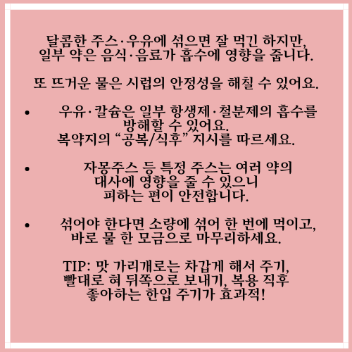 달콤한 주스·우유에 섞으면 잘 먹긴 하지만, 일부 약은 음식·음료가 흡수에 영향을 줍니다. 또 뜨거운 물은 시럽의 안정성을 해칠 수 있어요.