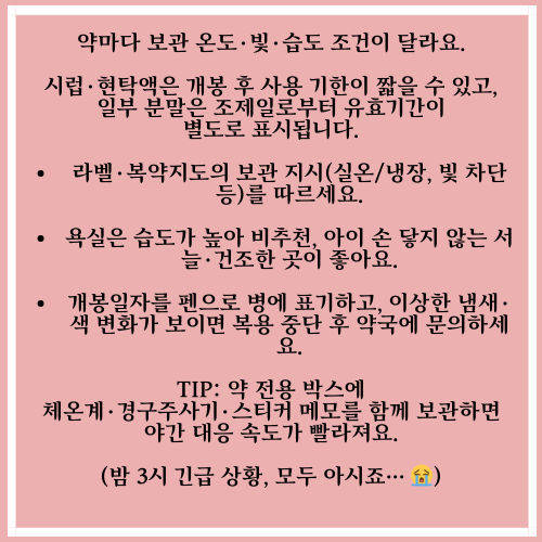 약마다 보관 온도·빛·습도 조건이 달라요. 시럽·현탁액은 개봉 후 사용 기한이 짧을 수 있고, 일부 분말은 조제일로부터 유효기간이 별도로 표시됩니다.