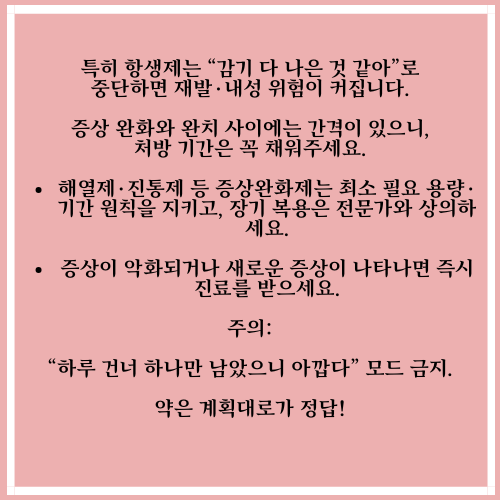 특히 항생제는 “감기 다 나은 것 같아”로 중단하면 재발·내성 위험이 커집니다. 증상 완화와 완치 사이에는 간격이 있으니, 처방 기간은 꼭 채워주세요.