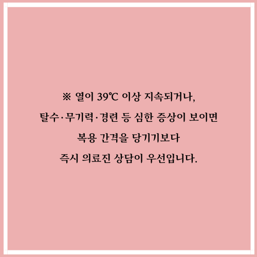 ※ 열이 39℃ 이상 지속되거나, 탈수·무기력·경련 등 심한 증상이 보이면 복용 간격을 당기기보다 즉시 의료진 상담이 우선입니다.