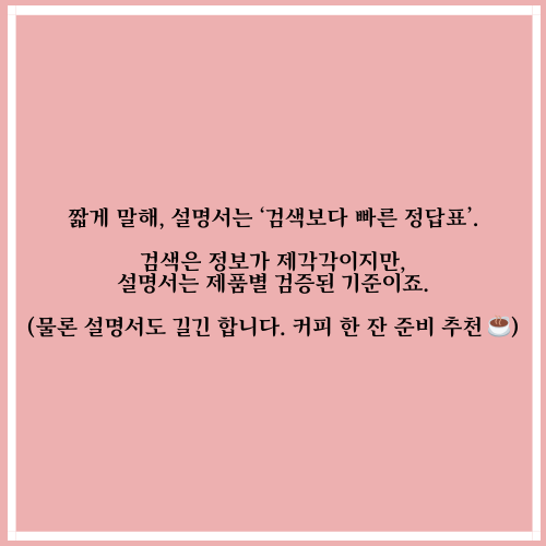 짧게 말해, 설명서는 ‘검색보다 빠른 정답표’. 검색은 정보가 제각각이지만, 설명서는 제품별 검증된 기준이죠. (물론 설명서도 길긴 합니다. 커피 한 잔 준비 추천 ☕)