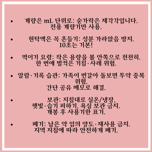 - 현탁액은 꼭 흔들기: 성분 가라앉음 방지. 10초는 기본!