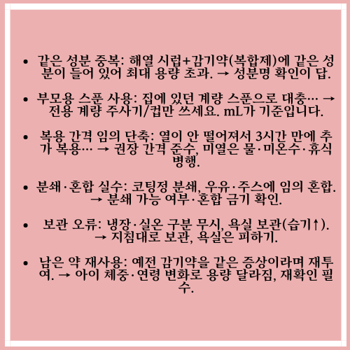 - 복용 간격 임의 단축: 열이 안 떨어져서 3시간 만에 추가 복용… → 권장 간격 준수, 미열은 물·미온수·휴식 병행.