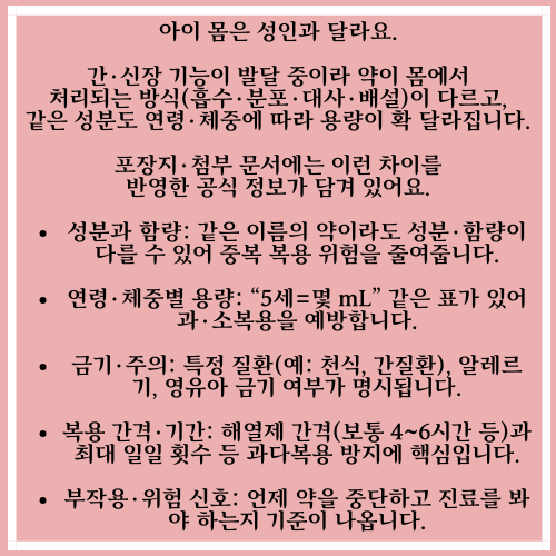 아이 몸은 성인과 달라요. 간·신장 기능이 발달 중이라 약이 몸에서 처리되는 방식(흡수·분포·대사·배설)이 다르고, 같은 성분도 연령·체중에 따라 용량이 확 달라집니다. 포장지·첨부 문서에는 이런 차이를 반영한 공식 정보가 담겨 있어요.