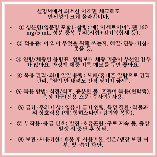 - 복용 간격·기간: 해열제 간격(보통 4~6시간 등)과 최대 일일 횟수 등 과다복용 방지에 핵심입니다.