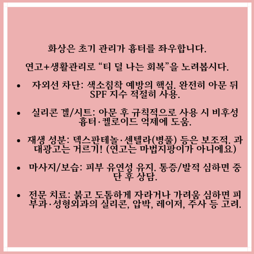 화상은 초기 관리가 흉터를 좌우합니다. 연고+생활관리로 “티 덜 나는 회복”을 노려봅시다.