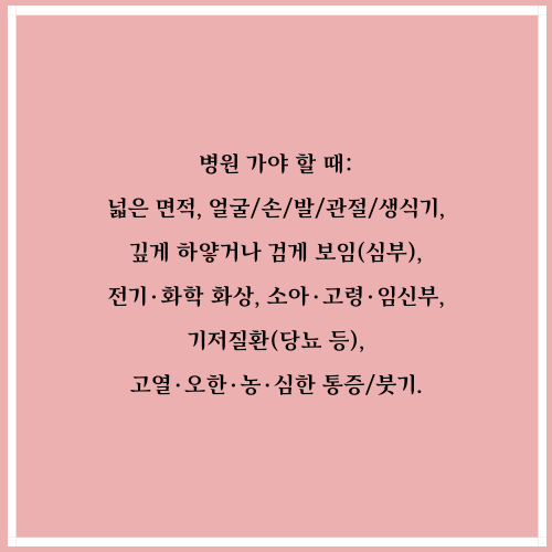 병원 가야 할 때: 넓은 면적, 얼굴/손/발/관절/생식기, 깊게 하얗거나 검게 보임(심부), 전기·화학 화상, 소아·고령·임신부, 기저질환(당뇨 등), 고열·오한·농·심한 통증/붓기.