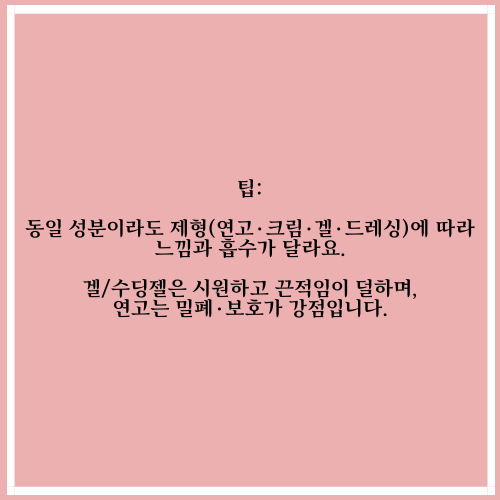 팁: 동일 성분이라도 제형(연고·크림·겔·드레싱)에 따라 느낌과 흡수가 달라요. 겔/수딩젤은 시원하고 끈적임이 덜하며, 연고는 밀폐·보호가 강점입니다.