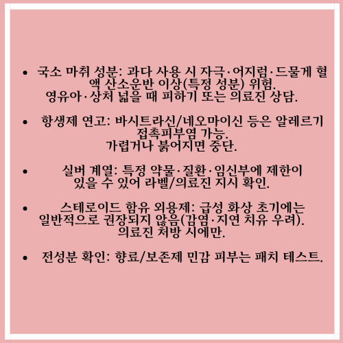 - 항생제 연고: 바시트라신/네오마이신 등은 알레르기 접촉피부염 가능. 가렵거나 붉어지면 중단.