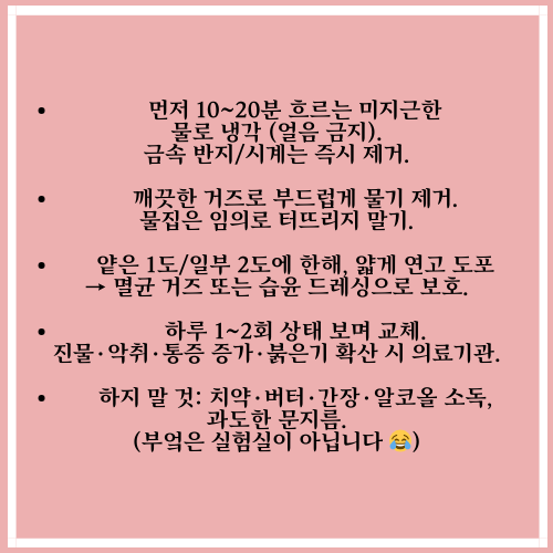 오늘 글은 정확한 응급처치 → 연고 선택 → 사용법 → 부작용 체크 → 흉터 관리까지,