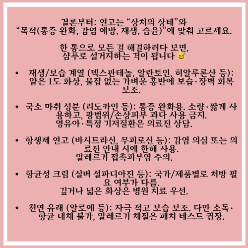 결론부터: 연고는 “상처의 상태”와 “목적(통증 완화, 감염 예방, 재생, 습윤)”에 맞춰 고르세요. 한 통으로 모든 걸 해결하려다 보면, 샴푸로 설거지하는 격이 됩니다 😅