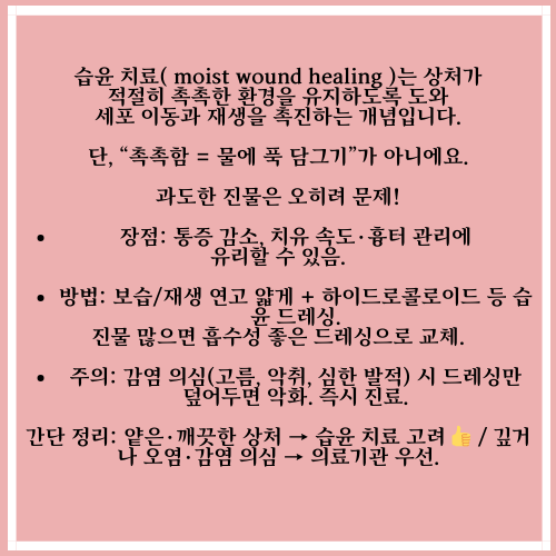 간단 정리: 얕은·깨끗한 상처 → 습윤 치료 고려 👍 / 깊거나 오염·감염 의심 → 의료기관 우선.