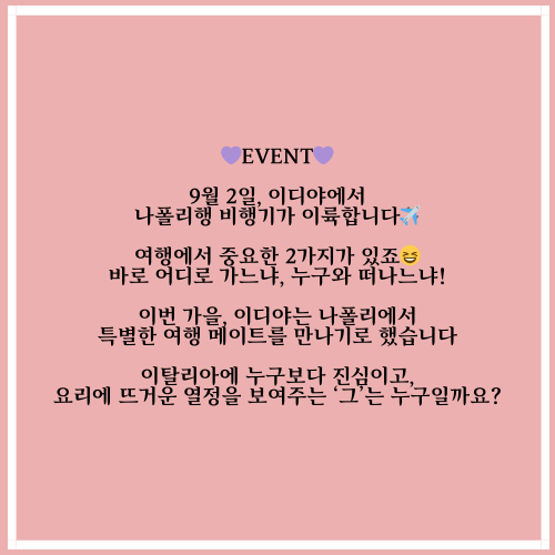 이번 가을, 이디야는 나폴리에서 특별한 여행 메이트를 만나기로 했습니다. 요리에 누구보다 진심이고, 열정을 불태우는 ‘그’와의 콜라보! 주인공은 9월 2일 공개됩니다.