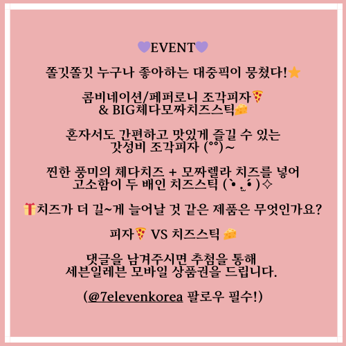 🍕🧀 피자 vs 치즈스틱 취향 투표 이벤트입니다. @7elevenkorea를 팔로우하고 이벤트 게시물에서 피자🍕 또는 치즈스틱🧀을 선택해 댓글로 참여하면 추첨을 통해 세븐일레븐 모바일 상품권 5,000원권(10명)을 드려요. 일정은 08/28(목)~09/03(수), 당첨 발표는 09/09(화)예요.
