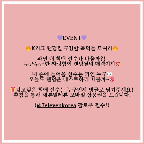 🔥 랜덤씰 모으는 재미에 시간 순삭! 세븐일레븐 X K리그 신상으로 최애 선수 뽑기 도전하고, 인스타그램 댓글 참여만으로 모바일 상품권까지 노려보세요. (오늘의 랜덤운, 슛~ 들어간다! ⚽🎲)