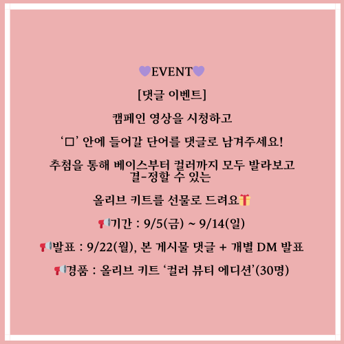[9/5~9/14] 올영 쿠션 캠페인 댓글 이벤트|영상 속 ‘□’ 정답 맞추고 올리브 키트 받자!