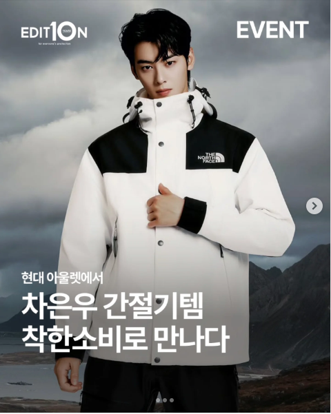 이번 행사는 현대 아울렛에서 진행되는 노스페이스 에디션 착한소비 프로젝트로, 차은우 간절기템을 구매하면 도움이 필요한 아이들에게 식량·식수 지원으로 연결되는 캠페인입니다. 합리적인 가격으로 직접 입어보고 구매할 수 있고, 인스타그램 이벤트 참여 시 경품 기회도 있어요!