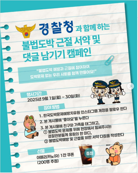 제17회 도박중독 추방의 날을 맞아 한국도박문제예방치유원이 준비한 특별 이벤트입니다. 올해는 경찰청이 함께해 불법도박 근절 의지를 더합니다. 인스타그램에서 응원 한마디와 서약 다짐을 남기면, 추첨으로 아메리카노(R) 쿠폰이 제공됩니다.