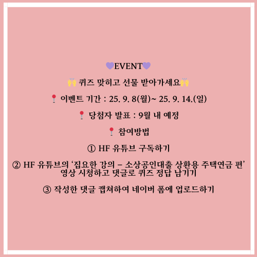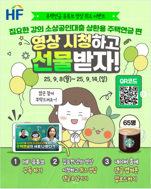 [EVENT] 집요한 강의 유튜브 영상 퀴즈 이벤트가 열렸습니다. 2025년 9월 8일(월)부터 9월 14일(일)까지 HF 유튜브를 구독하고, ‘집요한 강의 – 소상공인대출 상환용 주택연금 편’ 영상을 보고 퀴즈 정답을 댓글로 남긴 뒤, 작성한 댓글 캡쳐 화면을 네이버 폼에 업로드하면 참여가 완료돼요. 경품은 스타벅스 아메리카노 Tall 65명! (발표는 9월 내 예정)