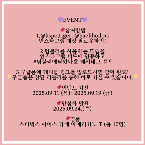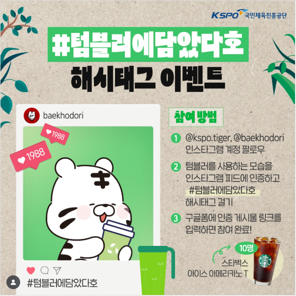 인스타그램에 본인의 텀블러 사용 모습을 인증하고, 지정 해시태그를 달아 참여하는 친환경 실천 이벤트입니다. 필수 조건은 @kspo.tiger, @baekhodori 두 계정 팔로우와 구글폼 링크 업로드까지! (사진 속 음료는 무엇이든 OK. 단, 내용물보다 텀블러가 주인공이어야죠 ✨)