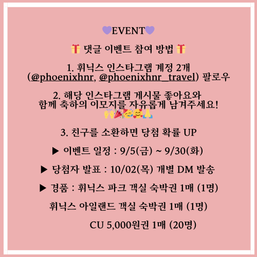 - 인스타그램 계정 @phoenixhnr, @phoenixhnr_travel 두 계정 모두 팔로우합니다.