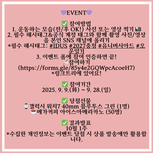 본 이벤트는 2025년 9월 9일(화)~9월 28일(일) 진행됩니다. 운동 인증 사진/영상을 필수 해시태그와 함께 본인 SNS에 올리고, 이벤트 폼까지 제출하면 참여 완료! IDUS 당일은 9월 20일(토)로, 기념 운동 인증 올리기 딱 좋은 날이에요. 💪