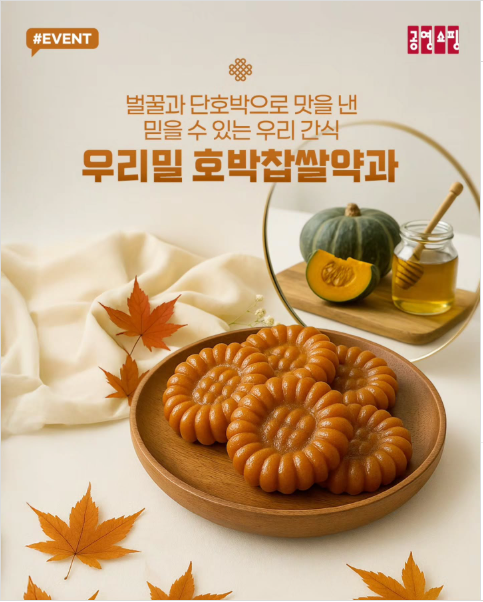 소개된 달콤한 호박찹쌀약과는 공영쇼핑에서 구매 가능하다고 안내되어 있습니다. 실제 구매·가격·재고는 시점과 판매처 공지에 따라 달라질 수 있으니, 공영쇼핑 상품 페이지에서 최신 정보를 확인하세요.