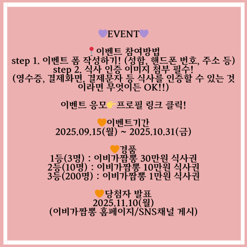 - 2등(10명): 이비가짬뽕 10만원 식사권