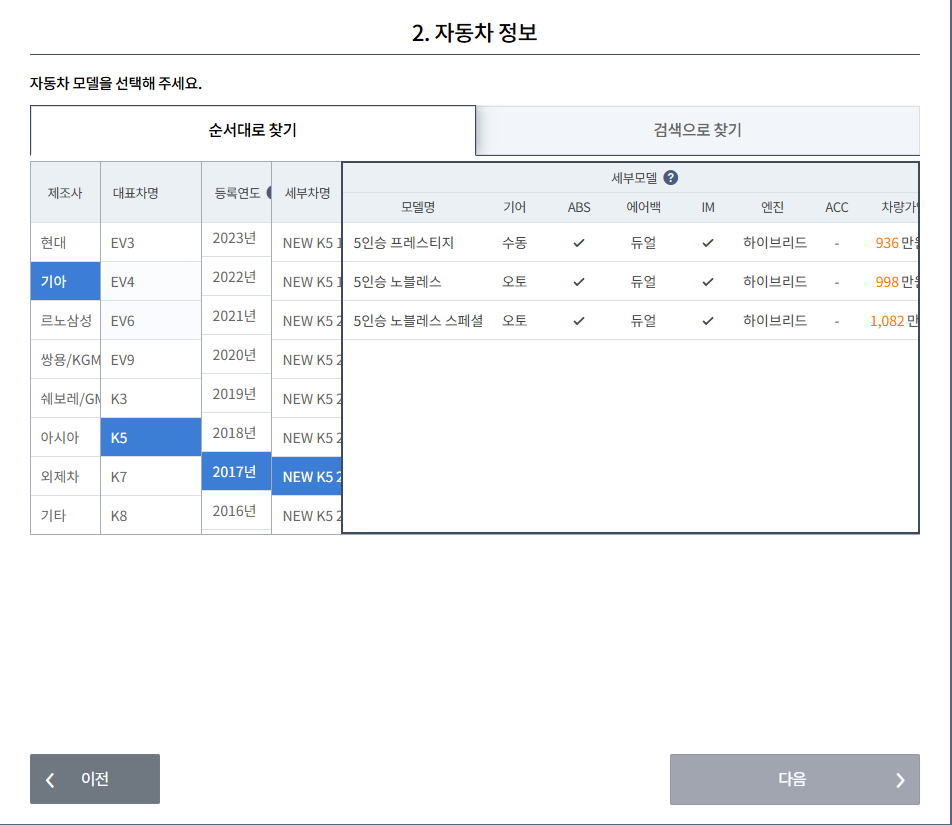 모바일로 하신다면 알려주신 차량 정보를 검색해서 입력하시면 돼요!!