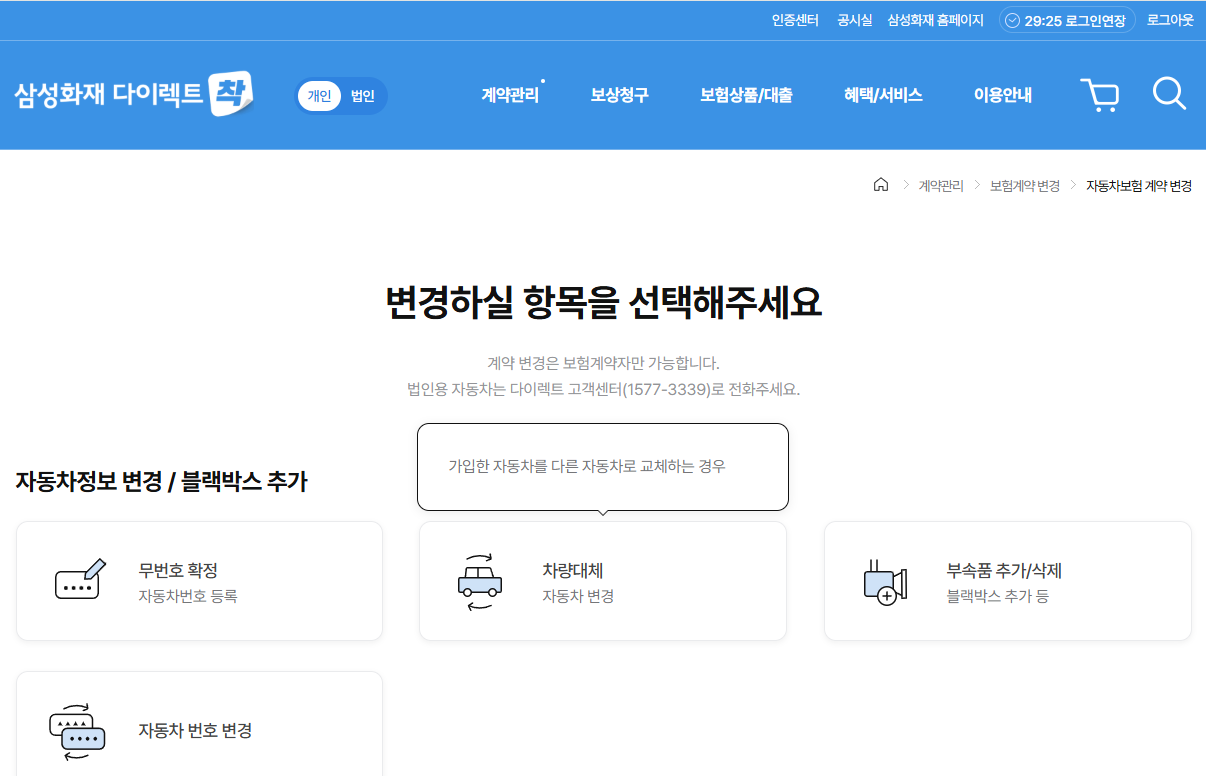 Step 1. 삼성화재 다이렉트 실행 → 로그인 →자동차보험 계약변경 클릭